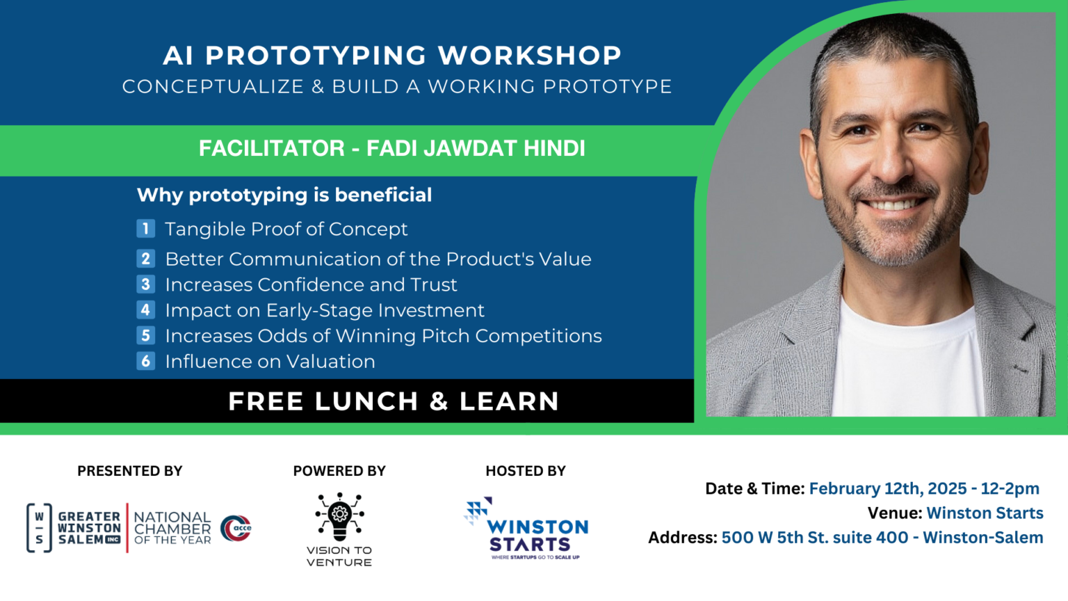 This Lunch & Learn will be a hands-on workshop and will focus on using AI for Product Prototyping. Perfect for adding a new service to your existing offerings or a great way to validate in real time prior to raising a new round of funding.